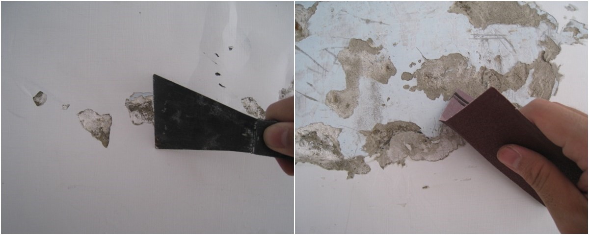 刮除表面批土與油漆層後,挖除劣化水泥砂漿層,至少 0.5 公分深(左);再利用砂紙或鋼刷將不良砂漿和粉屑清除乾淨,並用濕布將粉屑擦除(右)。