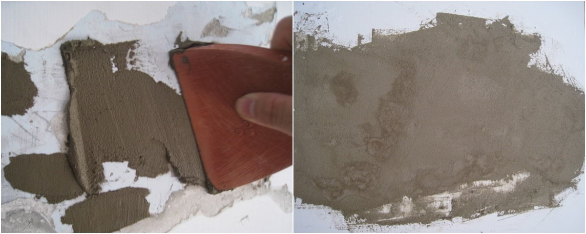 較淺坑洞用橡皮刮刀修飾平整,若無法附著,請確實清理粉屑再上工(左);若原壁面較為潮濕,建議做完水泥粉漿的修補後,靜置 7 天以上再行美化(右)。